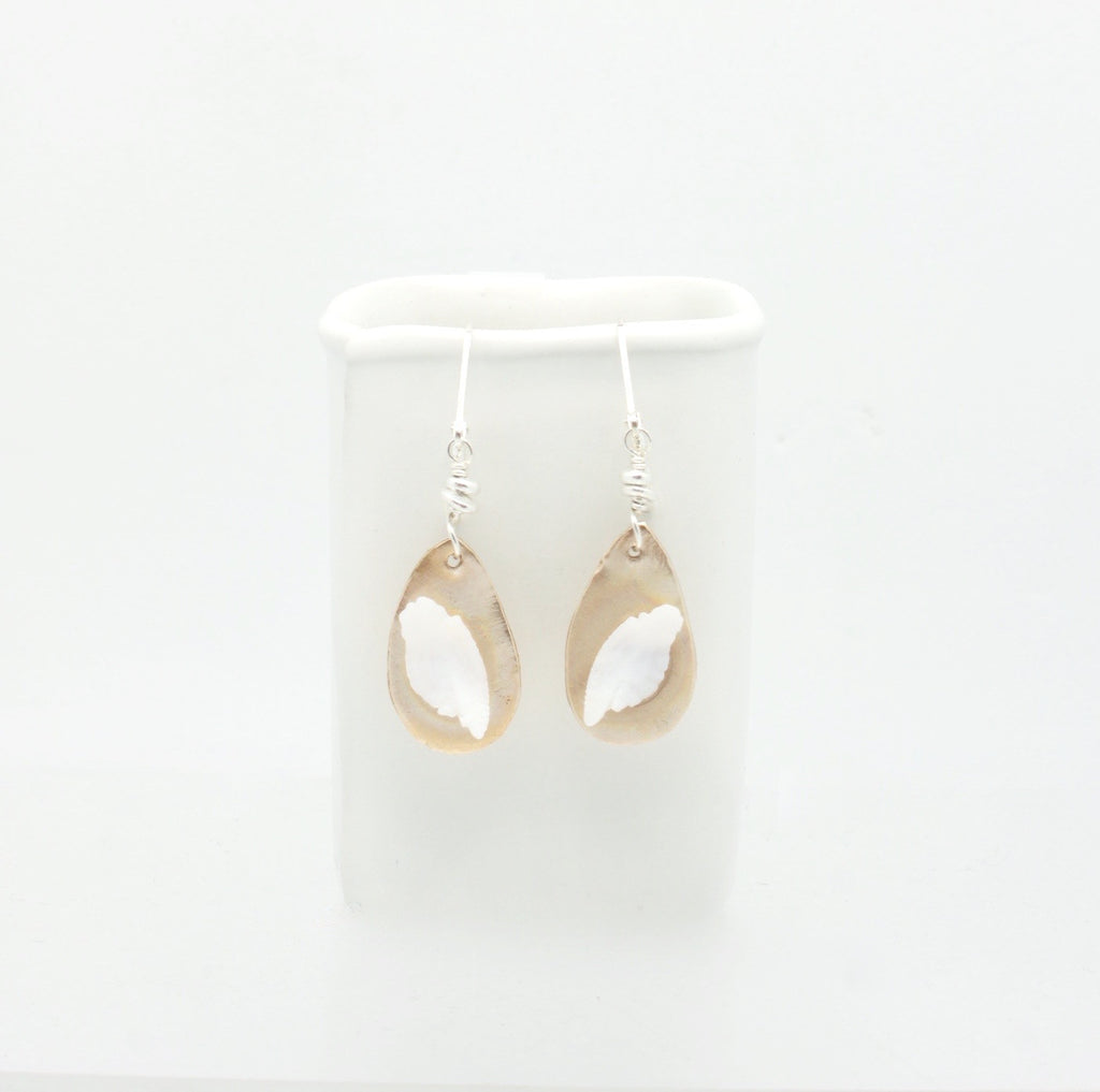 Neil requested a custom set of earrings for his partner Julia. He had collected these beautiful "otolith" bones from the Yelloweye snapper, caught in Haida Gwaii off the coast of BC, just south of Alaska. These fragile bones looked like delicate feathers or angel wings. After various attempts at wire wrapping and drilling holes (luckily Neil had a quite a collection of these bones), I decided that the safest and securest way was to use an epoxy on a set of earrings from my current collection. Well, Julia loved them, and now she requested a special custom set of earrings for her friend...stay tuned for the story behind those. Thank you Neil for entrusting your beautiful artifacts to me.